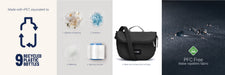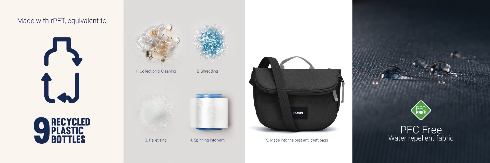 This product is made with post-consumer recycled polyester (rPET), equivalent to 9 recycled plastic bottles, and is treated with a 100% PFC-free water repellency.
